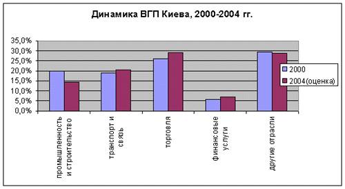 Годовой рост реального валового городского продукта (ВГП) Киева на протяжении последних пяти лет составляет в среднем 11%, что превышает рост ВВП Украины. По оценке, в 2004 г. ВГП вырастет как минимум на 8%. По прогнозам администрации, в 2005 г. ВГП увеличится еще на 8% (что представляется реалистичным) за счет прежде всего развивающегося сектора услуг. Следует, однако, учитывать, что это рост с довольно низкого уровня.