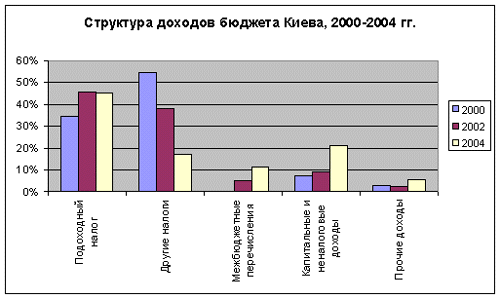 Основной источник доходов городского бюджета - это подоходный налог с физических лиц, обеспечивающий почти половину всех доходов города. В 2004 г. была введена единая 13-процентная ставка подоходного налога. Несмотря на тенденцию к выводу зарплаты из "тени" и расширение налоговой базы, доходы Киева по подоходному налогу в 2004 г. оказались на 16% меньше, чем в 2003 г., из-за снижения ставки налога. Это показывает, насколько велики риски, связанные с контролем центрального правительства за доходной базой города. Тем не менее, с 2005 г. уже наметился рост поступлений, за первое полугодие было собрано на 30% больше чем за аналогичный период 2004 г. С 2007 г. ставка подоходного налога повысится до 15%, что предполагает дополнительные поступления в городской бюджет.