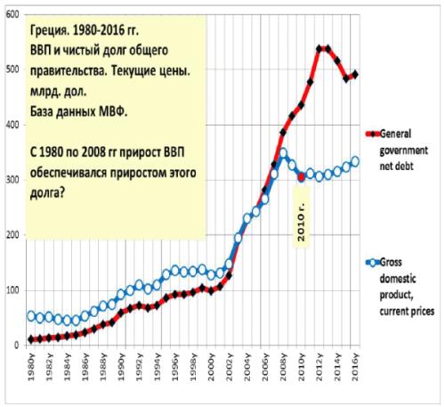 Как видно из Графика 2, начиная с 1980 г. (раньше данных в базе МВФ просто нет) и по 2008 г. прирост чистого долга общего правительства Греции в значительной степени обеспечивал (поддерживал) приросты ВВП. Создается впечатление, что без такого рискованного соотношения просто бы не было роста ВВП – роста благосостояния наших единоверцев-эллинов (или рост был бы куда менее значительным).