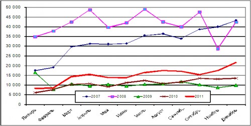Рис. 2. Продажи новых иномарок в Украине по месяцам в 2007-2011 гг.