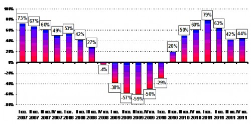 Поквартальные темпы прироста российского рынка в 2007-2011 гг. представлены ниже. Динамика роста остается устойчивой, несмотря на колебания мирового финансового рынка и постоянные пророчества о новом кризисе.