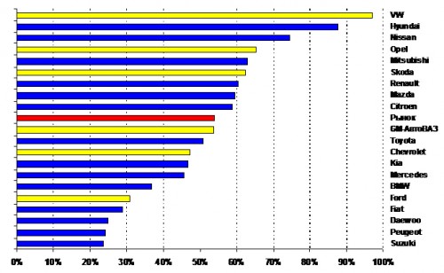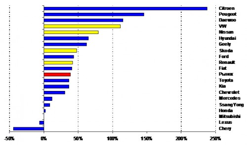 В ТОП-20 за 2011 год произошли определенные изменения. Главный прорыв –с десятого места в тройку лидеров – у VW. Наибольшее падение как в рейтинге, так и в продажах, показала марка Chery. Hyundai и Toyota удержали лидерство. Chevrolet, Mitsubishi и Honda росли медленнее рынка и потеряли позиции, в отличие от Ford, Skoda и Nissan.