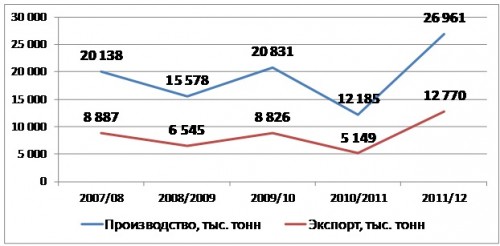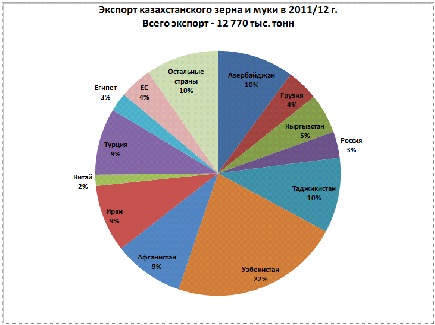 В прошедшем 2011-12 маркетинговом сезоне Узбекистан занял 22% экспортного рынка казахстанского зерна и муки. В прошлые сезоны его доля была не меньшей. В 2007-08 сезоне эта доля равнялась 11%, в следующем году тоже 22%, дальше - 20%. Пика объем экспорта зерна и муки достиг в 2010-11 году - 32%. Но в этом же году был самый меньший общий объем экспорта за эти периоды - 5149 тыс. тонн (см. график).