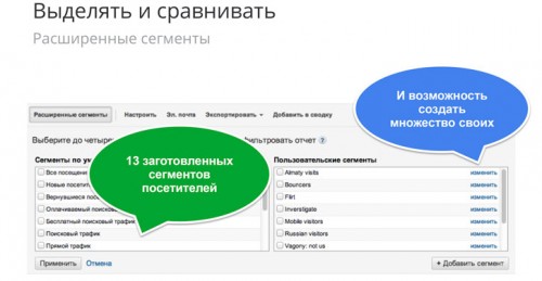 Замечательная вещь для анализа сайта уже после того, как вы все настроили и готовы выполнять конкретные задания в Google Analytics, это так называемые пользовательские сегменты. Они позволяют анализировать ваш поток трафика и разбивать посетителей по группам. В системе есть уже готовые сегменты, как, например, новые пользователи, пользователи, пришедшие по поиску или по прямому переходу... Сравнивая эти сегменты, вы можете делать выводы о том, какая аудитория активнее — лучше покупает, более заинтересована в вашем продукте и т.д. Обладая такой информацией, вы можете корректировать свою политику, приоритеты, и, возможно, что-то менять на сайте.