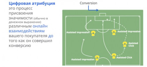Многоканальные последовательности и модели атрибуции - сегодня это, так сказать, high-level в аналитике. Их можно представить себе, как футбол: 11 человек одновременно играют на поле, пасуют друг другу, но только один из них в итоге забивает гол. Примерно так в AdWords конверсия присваивается «игроку», который забил мяч в ворота. При этом есть много дополнительных каналов (другие игроки), которые могут сыграть роль в данной конкретной конверсии — дополнительные рекламные объявления, хорошие отзывы о вас, которые в последствии привели к тому, что гол забит...
