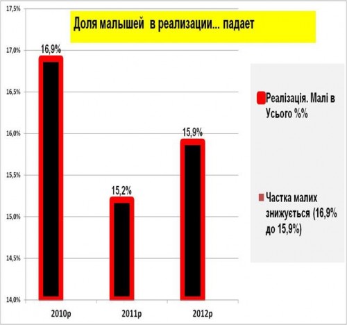 Уже следующий График «Реализация» неприятно удивляет: Неужели в более чем 4 трлн. грн. общей реализации «малыши» обеспечили только менее 700 млрд. грн.? Неужели наш малый настолько слаб?