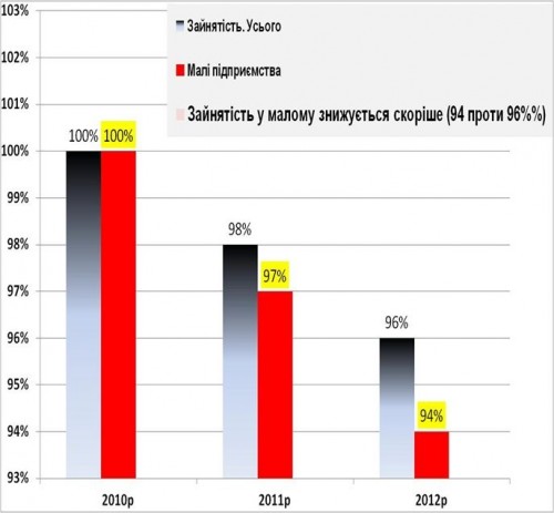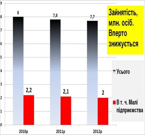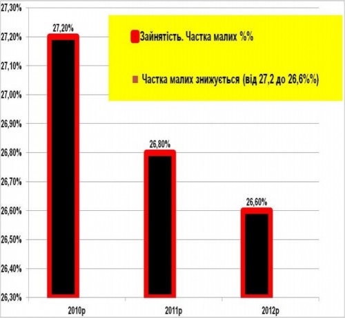 Соответственно падает и доля численности занятых в малом бизнесе: В 2010 г. в нем работало 27,2% от общей занятости, а в 2012 уже 26,6% (см. след График «Зайнятість. Частка малих»).