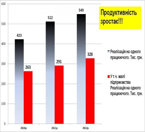 Реализация на одного работающего в 2010 г. составила 423 тыс. грн., а в 2012 г. она выросла до 549 тыс. грн.