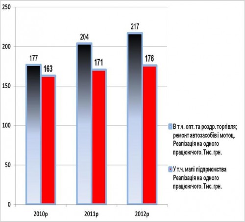 Во-первых, реализация на одного работающего (217 тыс. грн. в 2012 г.) тут в разЫ ниже, чем в бизнесе в целом (549 тыс. грн. в 2012 г.) и по малышам в целом (328 тыс. грн. в 2012 г.). Такого нелепого соотношения не было даже при большевиках – реализация на одного работающего в торговле всегда (!) была выше, чем по экономике в целом.