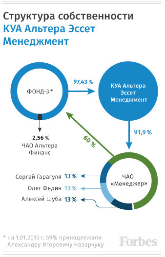 Во втором квартале 2013-го среди бенефициаров «Менеджера» вместо Александра Назарчука появилось ООО «Фонд-3». Впрочем, 97% ООО Фонд-3 принадлежат ЧАО КУА «Альтера Эссет Менеджмент». «Структура собственности, в которой доля одного из предприятий напрямую или через цепочку предприятий, зациклена на своих учредителях, не нарушает законодательство. Нарушение может возникнуть, только если ООО имеет своим единым участником хозяйственное общество, в том числе, акционерное общество, участником которого является одно лицо. То есть, запрещены только вертикальные структуры со 100% долями», – отметила Анна Бабич, партнер «ЮК Василь Кисиль и партнеры». Введение в учредители ООО Фонд-3 эксперты по корпоративному праву связывают с переоформлением прав собственности в связи с поступлением собственников на государственную службу.