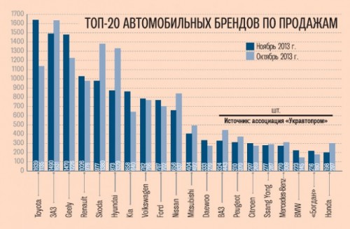 Показательным рост продаж был не у Toyota, а у Geely, занявшей вторую строчку в топ-20 популярных автомобилей, полагает Андрейченко. В ноябре было реализовано 1470 китайских машин, что в 3,6 раза больше показателя за соответствующий период 2012 г.