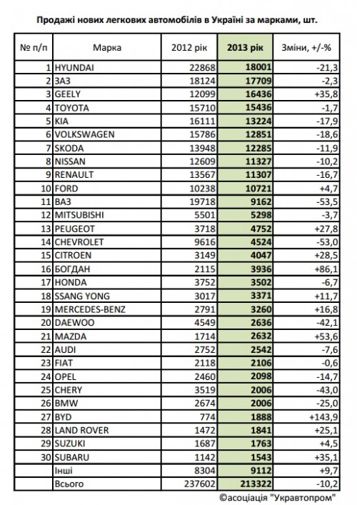 В целом, по оценке «Укравтопрома», в 2013 г. было продано 213,3 тыс. автомобилей, тогда как годом ранее этот показатель составлял 237, 6 тыс..