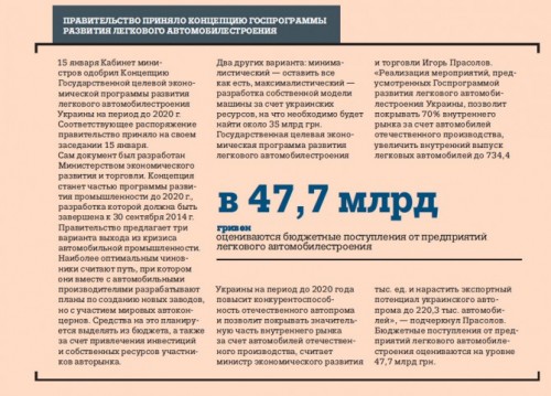 Главные надежды украинских автозаводов связаны с принятой в январе концепцией программы развития легкового автомобилестроения до 2020 г. Резник уверен, что предложенные авторами документа меры помогут нашим предприятиям в ближайшие восемь лет нарастить выпуск автомобилей до внушительной отметки — 750 тыс. единиц в год.