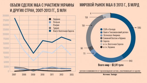 Наша страна следовала мировым трендам в сфере M&A. Как рассказали «Капиталу» в Dealogic, объем сделок с участием Украины в качестве продавца, покупателя или страны происхождения активов после трехлетнего падения в 2013?м продемонстрировал рост более чем в два раза — до $ 4,2 млрд.