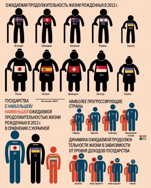 В период 1990?2012 гг. ожидаемая продолжительность жизни жителей нашей страны увеличилась на один год и теперь составляет 71 год. Жизнь украинских девочек, рожденных в 2012 г., ожидаемо продлится до 76?летнего возраста, что на целых десять лет больше аналогичного показателя мальчиков. Таковы результаты ежегодного отчета «Мировая статистика здравоохранения 2014», подготовленного экспертами Всемирной организации здравоохранения (ВОЗ).