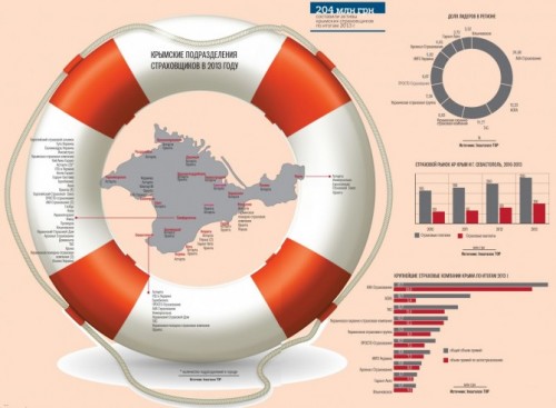 По данным Нацкомфинуслуг, в 2013 г. в Крыму действовало семь региональных рисковых страховых компаний: «Ангарант», «Адмиралтейская», «Европейский выбор», «Крымская страховая компания», «Крым-Афес», «Крымский страховой альянс» и «Юпитер-М». В прошлом году активы крымских страховщиков достигли 204 млн грн, страховые премии — 50,5 млн грн, а выплаты — 4,8 млн грн. Еще более 80 региональных отделений украинских страховщиков, которые тоже работали в Крыму, по оценкам Лиги страховых организаций Украины (ЛСОУ) собрали за 2013?й 230 млн грн страховых премий и выплатили компенсации в размере около 100 млн грн. На полуострове работало около 1 тыс. страховых агентов.