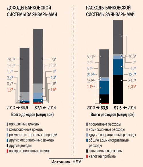 По сравнению с аналогичным периодом прошлого года как доходы, так и расходы украинских финучреждений выросли. Но издержки увеличивались более динамично: рост расходной части составил 52,8?%, тогда как доходной — всего 34,3?%. Увеличение расходов банков обусловлено прежде всего формированием резервов. В структуре расходной части доля отчислений в резервы с февраля 2014 г. стабильно держится на уровне выше 30?%. Объем отчислений в мае составил 10 млрд грн и по итогам пяти месяцев 2014 г. достиг 33,8 млрд грн. За аналогичный период прошлого года финучреждения потратили на формирование резервов в три раза меньше. Платежеспособные банки делали доотчисления в резервы по валютным кредитам в связи с ростом курса доллара, говорит председатель правления банка «Хрещатик» Дмитрий Гриджук.