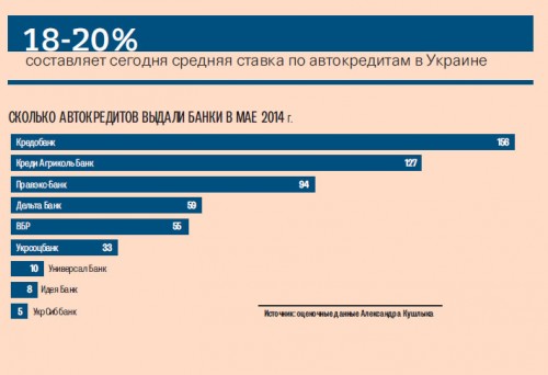 Чтобы получить автокредит, придется еще и побегать. Если в прошлом году деньги на покупку машины давали 30?35 банков, то к июню 2014 г. их число сократилось в три-четыре раза. «На сегодняшний день активно кредитуют покупку автомобилей не более восьми финучреждений», — подсчитал директор департамента альтернативных каналов продаж Дельта Банка Константин Кошеленко. Среди них Кредобанк, Дельта Банк, Правэкс-Банк, УкрСоцбанк (UniCredit Bank), ВБР и Креди Агриколь Банк.