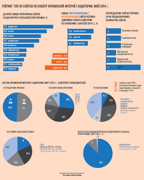 По состоянию на май 2014 г. размер интернет-аудитории нашей страны составил около 18,7 млн жителей в возрасте не младше 14 лет, что значительного превышает показатели января 2014 г. (17,8 млн). Согласно данным за март 2014 г., число украинских женщин и мужчин, пользующихся услугами всемирной паутины, примерно одинаковое (51,2?% против 48,8?%). Самой многочисленной группой интернет-пользователей являются молодые украинцы в возрасте 25?34 года (30,7?%). Более трети украинских юзеров имеют высшее образование (38,8?%) и живут в крупных городах (36,8?%). Стоит отметить высокий уровень интернет-зависимости украинцев: абсолютное большинство (87,6?%) онлайн-пользователей не могут и дня прожить, чтобы не посетить любимые сайты.