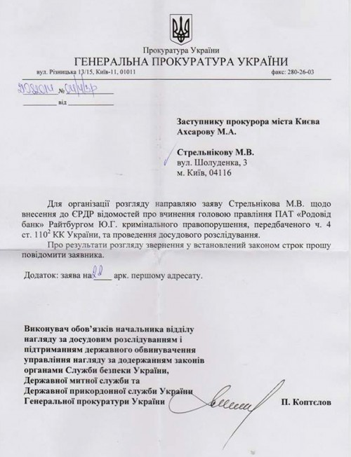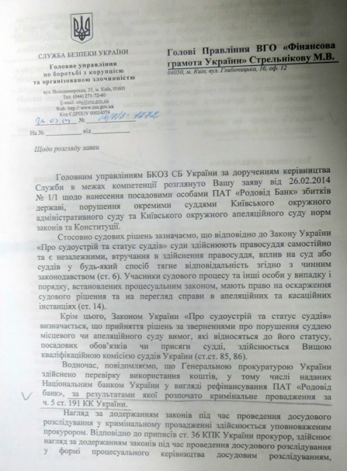 СБУ порадовало. Оно сообщило, что дело "Родовида" расследует Генпрокуратура. Поскольку там есть хищения в особо крупных размерах, оно все материалы пересылает туда, чтобы две организации не вели одно и то же дело.