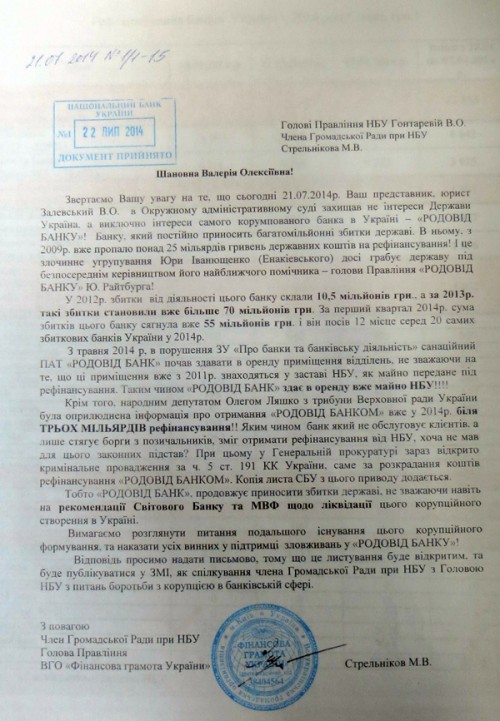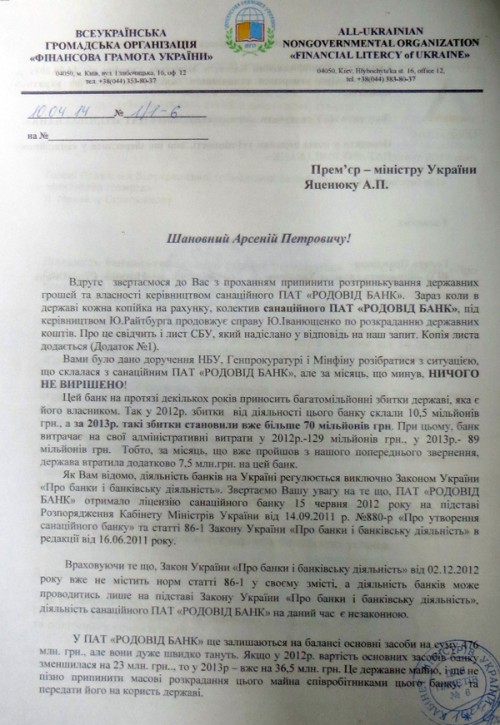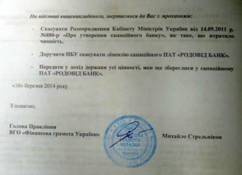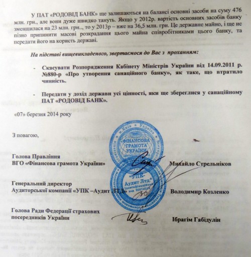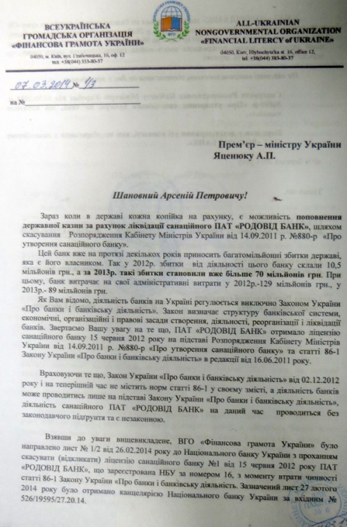 После этого несколько общественных организаций обратились к Арсению Яценюку: "Зараз, коли в державі кожна копійка на рахунку, є можливість поповнити державну казну за рахунок ліквідації санаційного Родовід-банку. Цей банк протягом кількох років приносить багатомільйонні збитки державі".