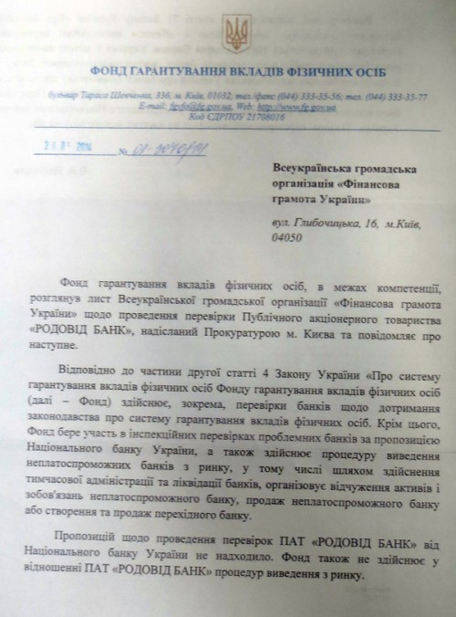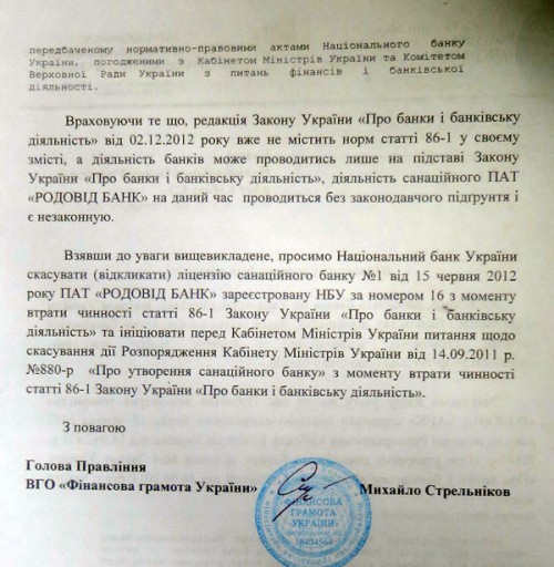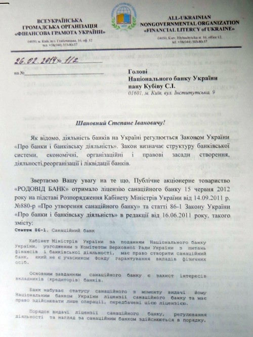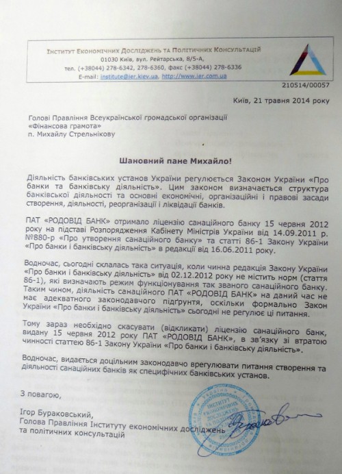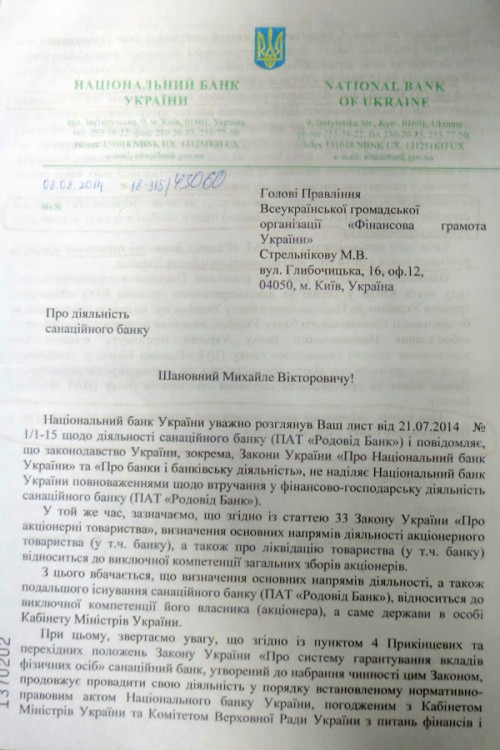 В начале 2014 года общественная организация "Финансовая грамота Украины", председателем правления которой я являюсь, направила письмо тогдашнему главе НБУ Степану Кубиву о том, что лицензия на санационный банк действует не совсем в рамках законодательства.