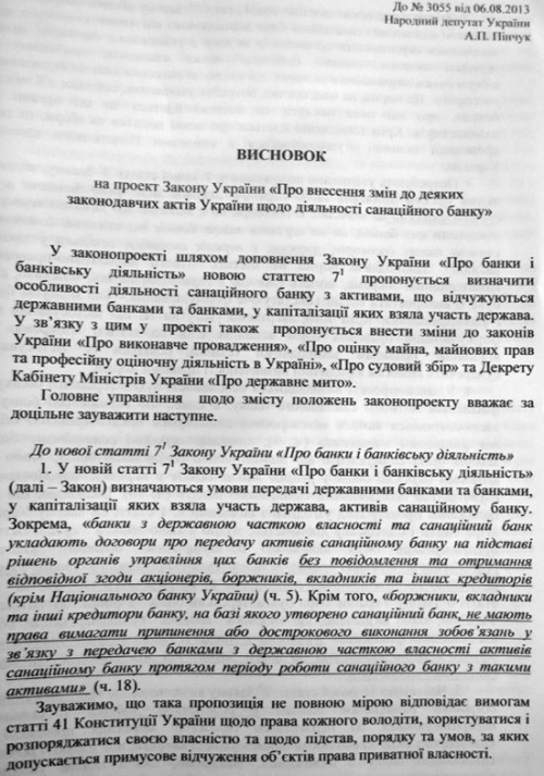 Таких законопроектов за время существования санационного банка было несколько. Один подавал Кабмин, парламент его отклонил. Второй внес народный депутат Андрей Пинчук. Судьба этого законопроекта оригинальна.