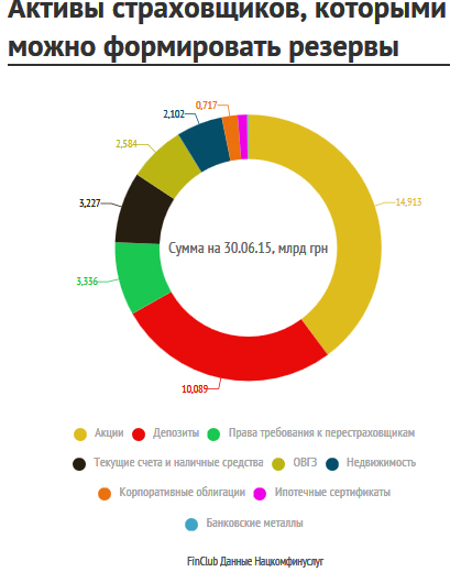 Для страховщиков акции – один из основных инструментов формирования резервов. По данным Нацкомфинуслуг, на 30 июня у всех СК было активов на 63,56 млрд грн. Из них только активы на 37,46 млрд грн подходили под нормативы формирования резервов. На акции в этом портфеле приходилась максимальная доля – 39,8%, или 14,9 млрд грн. На втором месте – депозиты – 26,9% (10,1 млрд грн). Права требования к перестраховщикам и средства на текущих счетах – чуть менее, чем по 9%: 3,3 млрд грн и 3,2 млрд грн соответственно. «Реальных денег в активах страховщиков не так и много», – сказал FinClub член правления Нацкомфинуслуг Александр Залетов. Лишь активы на 16,6 млрд грн страховщики использовали для формирования резервов.