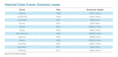 Тщательный анализ обычно был бы решением этой проблемы, но сектору кибер (пере)страхования не хватает пищи для такого рода усилий. Команда PCS рассмотрела экономические потери от крупных кибер событий за последние 20 лет, причем дюжина из них достигла не менее 500 миллионов долларов США. Хотя каждое крупное событие несет уроки для носителей риска, быстро меняющиеся обстоятельства, усугубляемые временем, могут свести на нет преимущества обучения на основе прошлого и затруднить размещение капитала.