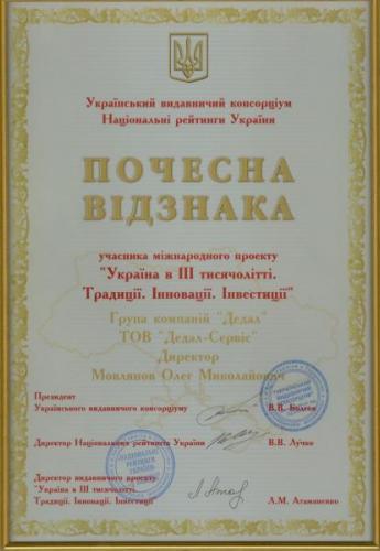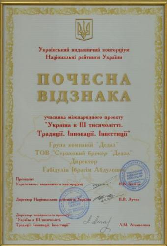 Компанії „Страховий брокер „Дедал” та „Дедал-Сервіс” прийняли участь у міжнародному проекті „Україна в ІІІ тисячолітті. Традиції. Інновації. Інвестиції” та були нагороджені „Почесною Відзнакою учасника міжнародного проекту „Україна в ІІІ тисячолітті. Традиції. Інновації. Інвестиції”.