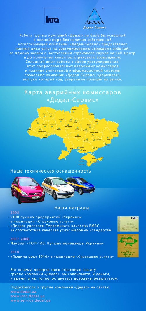 Кроме того, страхователи получат полный сервис при наступлении страховых событий от дочерней компании "Дедал-Сервис", имеющей 46 представительств во всех регионах Украины. Аварийные комиссары компании "Дедал-Сервис" будут выезжать на место ДТП и осуществлять полный комплекс услуг по урегулированию убытков, ремонту автомобиля на сертифицированной станции "Пежо", а также осуществлять контроль за выплатой страхового возмещения. Вот только один пример работы аварийных комиссаров компании "Дедал-Сервис" в октябре 2011 г..