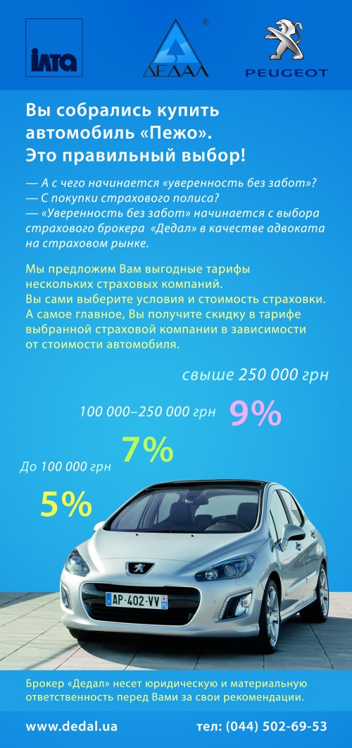 С января 2012 г. официальный дилер автомобилей "Пежо" компания "Илта" и страховой брокер "Дедал" договорились об акционной продаже автомобилей со страховкой от брокера. Каждый покупатель автомобиля "Пежо" сможет по желанию застраховать своего любимца прямо в салоне со скидкой от 5% до 9% в зависимости от стоимости машины. Будут предложены условия страхования и тарифы трех надежных страховых компаний. Брокер имеет страховку своей профессиональной ответствености, защищающую интересы страхователя при ошибках и упущениях сотрудников брокера "Дедал".