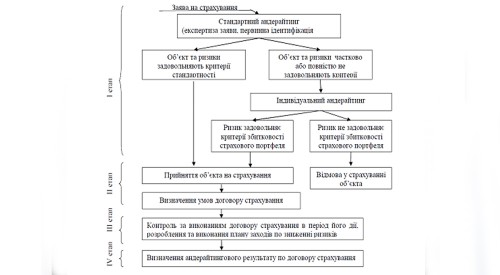 Процес андерайтингу – це комплексний процес, який умовно можна поділити на чотири етапи, кожний з яких потребує професійної організації та відповідального виконання. У загальному вигляді процедуру андерайтингу можна представити у вигляді комплексу взаємопов’язаних бізнес-операцій. [1] (рис. 6)