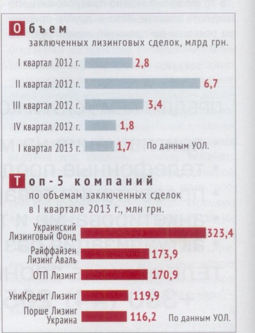 В январе — марте текущего года лидером по объемам заключенных сделок стала компания «Украинский Лизинговый Фонд», подконтрольная российскому Внешэкономбанку. Как уже сообщал БИЗНЕС, эта компания захватила лидерство на рынке еще по итогам трех кварталов 2012 г. Почти вдвое меньшие объемы сделок по сравнению с лидером по итогам 1 квартала текущего года задекларировали компании с западными корнями - «Райффайзен Лизинг Аваль» и «ОТП Лизинг» (полученные ими результаты скромнее, чем в IV квартале 2012 г.). Еще более скромные результаты — у «УниКредит Лизинга» и «Порше Лизинга» (см. «ТОП-5 компаний...»).
