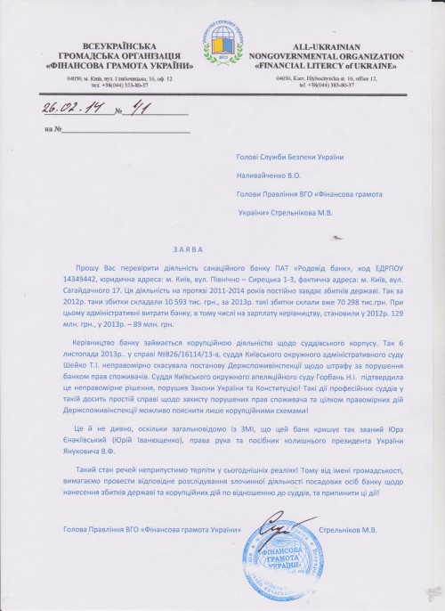 Сегодня судья Киевского админинистративного апелляционного суда Горбань Н.И. за 2 минуты утвердила решение судьи Киевского окружного административного суда Шейко Т.И. отменив штраф Госпотребинспекции к РОДОВИД Банку за грубое нарушение прав потребителя! При этом наплевав на ЗАКОН и КОНСТИТУЦИЮ! Банк Юры Енакиевского по прежнему рулит в судах!!! Вопрос - сколько это безобразие еще будет продолжаться? Вопрос к Турчинову А., Наливайченко В. и Махницкому О.!!!
