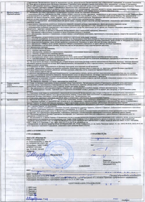 Возмущает наглость и беспредел региональных менеджеров компании "Юпитер-М", которые полис добровольного медицинского страхования (ДМС) впаривают инвалиду за мифические услуги. Мы не будем перечислять сам договор страхования, с ним можно познакомиться по ссылке (стр.1, стр.2). При этом, мы обращаем внимание только на размер тарифа 6,667%, в то время, как стоимость подобной страховки на рынке с бОльшими опциями и лимитом ответственности составляет чуть больше 5%. Как хватило совести у местного отделения страховой компании "Юпитер-М" в Симферополе заставить купить полис инвалида, взяв с него страховой взнос в размере 200 грн при пенсии по инвалидности 1500 грн в месяц. Как могли работники страховой компании в сговоре с медиками использовать добровольно-принудительный метод распространения страховых услуг среди наших граждан.