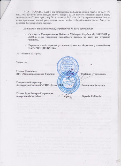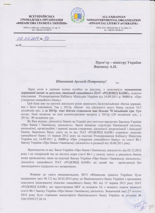 Обращение к премьер-министру Украину Яценеку А.П. прилагается (стр.1, стр.2).
