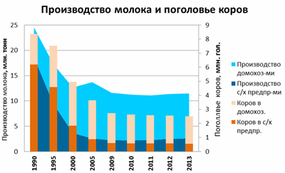 Больше всего сельское хозяйство пострадало в начале и в средине 90-х годов от суперинфляции, и когда старая колхозная система была разрушена, а новые формы хозяйствования еще не предстали. Основной проблемой молочного сектора в этот период стало стремительное падение объемов производства молока (см. график) в результате массового вырезания скота и уменьшения надоев.