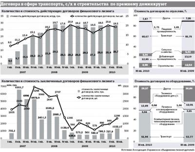 С III квартала 2008 г. рынку лизинга пришлось испытать неприятную тенденцию слабого прироста новых договоров и проблемы с платежеспособностью имеющихся лизингополучателей. Если в докризисный период лизинговым компаниям удавалось заключать по 2,5–3 тыс. договоров финансового лизинга ежеквартально, то в 2009-2010 гг. их урожайность была в три-пять раз ниже (550-980 договоров). Но уже начиная с III квартала прошлого года рынок стал оживать. За этот отчетный период количество новых договоров финансового лизинга увеличилось на 30% (в сравнении с предыдущим кварталом). При этом их объем вырос почти вдвое — до 1,332 млрд. грн.