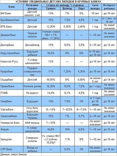 Депозиты банки открывают детям любого возраста. У одних финучреждений для этого есть специальные детские вклады (см. таблицу), у других — нет. Но по словам начальника отдела развития расчетных и пассивных операций банка «Финансы и Кредит» Юлии Солодовник, если специального детского вклада в банке нет, можно открыть любой другой депозит на любой удобный срок. Хотя спецвклады все же интереснее обычных депозитов для взрослых и показывают, как сильно банкиры любят детей. По таким вкладам скромнее минимальные суммы (в разных банках от 100 до 2 тыс. грн.), а ставки чуть выше, чем по обычным (на 1—1,5% по вкладам в гривне, на 0,5% — в валюте). Кроме того, некоторые банки дают бонусы за крупные суммы (0,1—0,5% к ставке). К тому же почти всегда эти вклады предусматривают капитализацию процентов (то есть проценты добавляются к сумме вклада), что еще больше увеличивает их прибыльность.