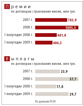 Рынок страхования жизни переживает последствия падения платежеспособности клиентов. В первую очередь это сказывается на сборах страховых премий. Согласно данным Государственной комиссии по регулированию рынков финансовых услуг (Госфинусуг), компании по страхованию жизни за январь — июнь 2009 г. собрали 404,3 млн грн. страховых премий, что на 15,9% меньше, чем за аналогичный период 2008 г. Очевидно, что ситуация ухудшается, так как падение сборов в I квартале составляло около 10%. По данным Лиги страховых организаций Украины (ЛСОУ; г.Киев; с 1992 г.; объединяет более 100 страховых компаний), у многих крупных участников рынка наблюдается резкое падение сборов так называемых премий первого года (премии, получаемые страховыми компаниями (СК) от клиентов в момент заключения долгосрочного договора страхования жизни), что свидетельствует о сокращении притока новых клиентов. В частности, по данным ЛСОУ, лидер рынка — СК “АЛИКО АИГ Жизнь” — по итогам первого полугодия 2009 г. получил премии первого года в размере 16,77 млн грн., что на 75,7% меньше, чем за аналогичный период 2008 г. — 69,1 млн грн. И это не единственный пример (см. “Топ-10…” на стр.34). Несмотря на крупные потери, многие страховщики полагают, что по итогам 2009 г. рынок, вероятнее всего, покажет незначительное падение сборов страховых премий. “По итогам года падение сборов страховых премий по рынку страхования жизни составит 10-20%, скорее, ближе к 10%”, — считает Павел Царук, экс-председатель правления СК “ТАС” (г.Киев; с 2000 г.; более 100 чел.). При этом некоторые участники рынка озвучивают и более оптимистические прогнозы. “Вероятно, в конце года объем валовых страховых премий окажется на том же уровне, что и в прошлом году. Ведь если у одних компаний идет падение премий, то у других — рост”, — прогнозирует Оксана Голеншина, председатель правления СК “УСГ Жизнь” (г.Киев; с 2003 г.; более 10 чел.). Судя по всему, СК все же рассчитывают в 2009 г. получить от клиентов около 1 млрд грн. (см. “Премии…”).