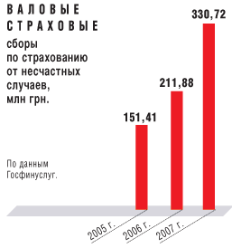 В прошлом году, по сравнению с 2006 г., объемы страховых платежей по страхованию от НС выросли на 56% — до 330,722 млн грн. (по данным Госфинуслуг). При этом, по словам страховщиков, на сегодняшний день добровольное страхование от НС не очень популярно среди населения. “Что же касается столь высокого показателя валовых страховых платежей, то это можно объяснить тем, что в последнее время добровольное страхование от НС осуществляется с участием банков при выдаче физическим лицам ипотечных и потребительских кредитов”, — уверяет Александр Прыймак, начальник отдела страхования СК “Нефтегазстрах” (г.Киев; с 1995 г.; 133 чел.). Кроме того, эксперты прогнозируют, что в 2008 г. общий объем страховых платежей по данному виду страхования вряд ли увеличится. “Думаю, что уровень выплат останется прежним либо пойдет на спад. Валовые платежи снизятся вследствие уменьшения активности банков в выдаче кредитов”, — объясняет г-н Прыймак. Напомним: Нацбанк начал активно бороться с потребительским кредитованием (см. БИЗНЕС №26 от 30.06.08 г., стр.36-38), что может привести к уменьшению его объема.