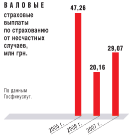 Интересно, что уровень страховых выплат по страхованию от НС в 2007 г. был очень низким — 8,8%. Это при том, что в 2006 г. этот показатель составлял 9,5%, а в 2005 г. — 31,2%. Такую ситуацию страховщики объясняют по-разному. Одни говорят, что по договорам страхования от НС редко страхуется временная потеря трудоспособности, что якобы приводит к низкому уровню выплат. Другие сетуют, что часто сами застрахованные не знают своих прав и не обращаются при наступлении страхового случая за возмещением. Третьи утверждают, что это погрешности статистики, и уровень выплат нельзя соотносить с суммой полученных премий за год, так как срок страхового полиса может превышать этот период. При этом страховщики признают, что договоры по страхованию от НС в основном краткосрочные. “Чаще всего договор заключается на год, но бывают и краткосрочные договоры, когда клиент выезжает за границу и заключает договор только на время свого пребывания (рабочие поездки, туризм) или на время турпохода по Украине, соревнований”, — рассказывает Наталья Спиридонова, начальник управления личного страхования СК “Оранта” (г.Киев; с 1921 г.; 10 тыс.чел.).