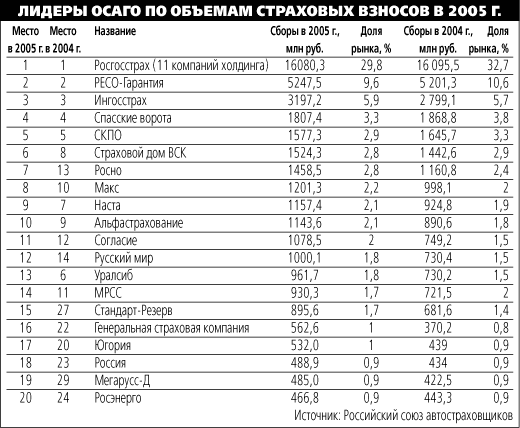 По предварительным данным РСА, в 2005 г. страховщики продали 28,73 млн полисов ОСАГО на 54,1 млрд руб. (в 2004 г. - 26,19 млн на 49,3 млрд руб.). Страховщики объясняют рост премий увеличением числа автомобилей в России. Выплаты оказались куда скромнее - 26,4 млрд руб. против 18,5 млрд руб. годом ранее.