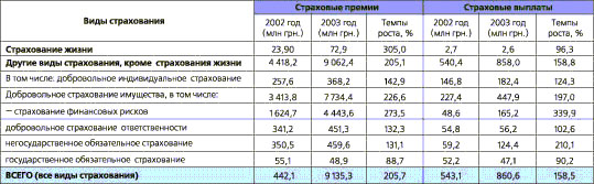 В 2003 г. по сравнению с 2002 г. значительно ускорились темпы роста объемов страховых премий по страхованию жизни — до 305% и добровольным видам имущественного страхования — до 227%. В общей сумме страховых премий по добровольным видам страхования 52% (4443,6 млн грн.) занимает страхование финансовых рисков (48,6% от страховых премий по всем видам страхования). Только по видам обязательного государственного страхования наблюдалось уменьшение объемов страховых премий на 11% по сравнению с 2002 г.