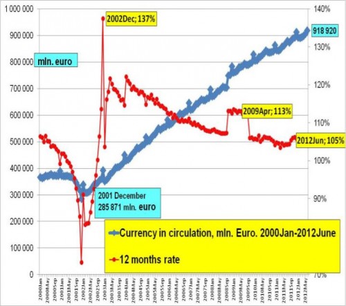 Более того, основной рост объемов евро, находящихся в обращении, состоялся уже довольно таки давно – задолго до кризиса-2008. Он имел место в конце 2002 года и достиг своего максимума в декабре того же года – аж 137%. Видимо, был результатом бурно развивавшегося кредитования южан.