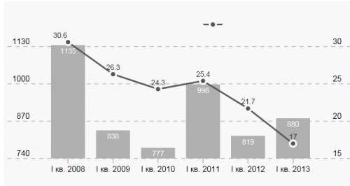 Филиальные сети, которые страховые компании (СК) активно развивали в 2005-2006 годах, перестали приносить объемы премий, на которые рассчитывали акционеры, инвестируя в открытие новых отделений. По данным отраслевого журнала Insurance Top, за три месяца 2013 года через филиалы страховые компании привлекли 880 млн грн, что составило всего 17% от общего объема премий. По итогам I полугодия этот показатель снизился до 16,8%. Хотя еще в 2008 году региональные подразделения были одним из основных каналов продаж: за I квартал они принесли страховщикам 1,1 млрд грн премий, а их удельный вес тогда превышал 30% (см. график).
