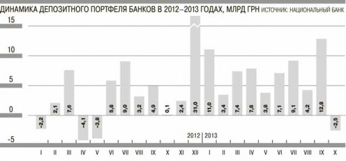 Впервые с весны прошлого года банки столкнулись с оттоком средств со своих счетов — их депозитный портфель в октябре сократился на 2,5 млрд грн. Главным образом изъятие средств осуществляли предприятия, которые вывели из системы 7,8 млрд грн. Однако это не вызвало кризиса ликвидности, поскольку в текущем году банковская система нарастила депозитный портфель на 74 млрд грн. До конца года банкиры планируют нарастить объем средств на депозитах, но в основном за счет краткосрочных ресурсов.