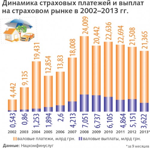 Падение выплат на страховом рынке резко контрастирует с показателями динамики сборов страховщиков. По сведениям небанковского регулятора, объем валовых страховых премий по итогам января–сентября по сравнению с аналогичным периодом 2012 г. увеличился на 35,2% (до 21,365 млрд грн.). Чистые страховые платежи (без учета внутреннего перестрахования) выросли на 8,7% (до 16,221 млрд грн.).