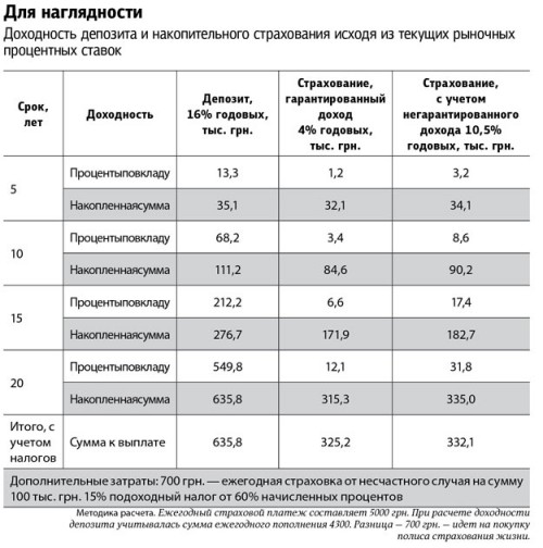 Но главная причина непопулярности накопительного страхования — в его меньшей доходности. «Инвестгазета» сравнила два варианта инвестирования: договор накопительного страхования и банковский депозит на тот же срок (см. таблицу) с ежегодной покупкой полиса лайфового страхования. Последний оказался почти вдвое выгоднее. «Основная задача накопительного страхования — не доход, а защита и создание финансовой «подушки безопасности», — говорит Комкова. — Это один из наиболее консервативных инструментов инвестирования, который дает минимальную доходность, но при этом гарантирует защиту вашей жизни и здоровья». Важно помнить, что 60% прибыли, полученной от накопительного страхования, облагаются 15%-ным налогом. К примеру, если сумма начисленных процентов составляет 100 тыс. грн., то 15% будет вычтено из 60 тыс. грн. В результате налоговые отчисления составят 9 тыс. грн. Доход от депозита налогом не облагается.